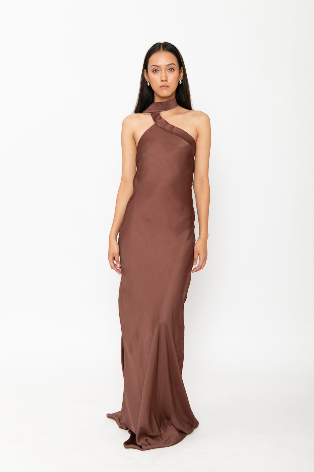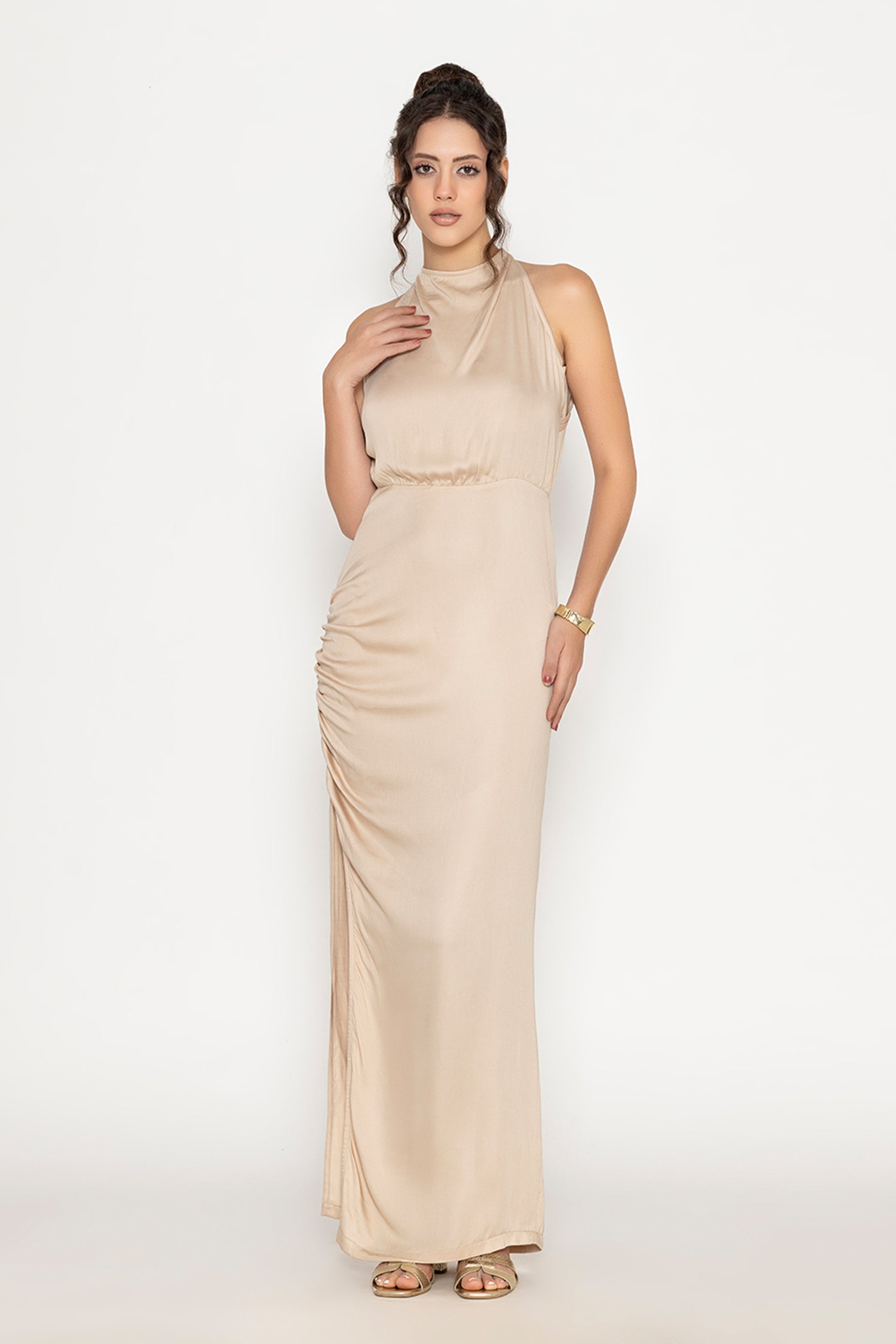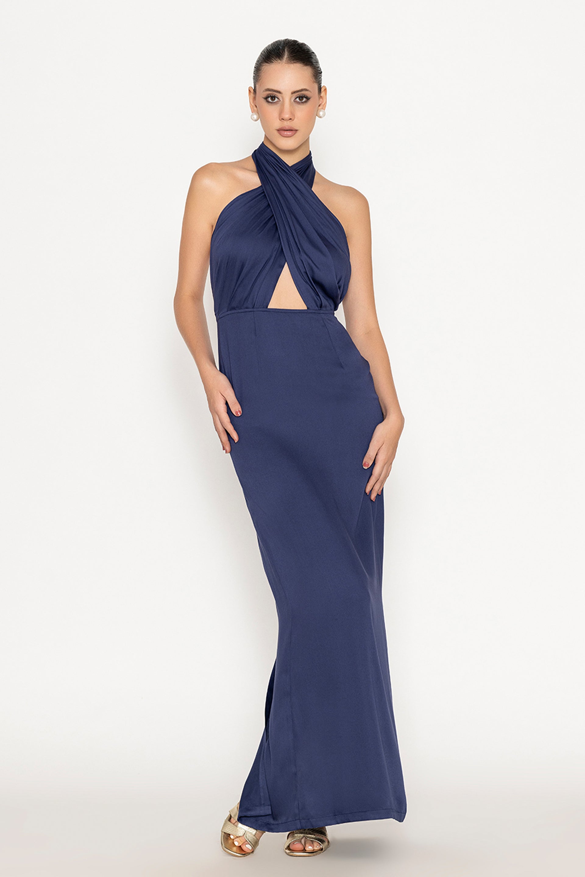 Minimalist but far from simple, this mustang gown silhouette features a cowl halter neckline and open back. The side slit adds movement, making it the best gown for sleek, effortless elegance. Perfect for gallery openings, cocktail nights, or anywhere your playlist is as curated as your outfit.