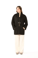A bell-sleeved coat with a crew neck and a center buckle closure at the waist. Features a boxy fit and includes two paneled pockets in the front, offering a structured, voluminous silhouette.