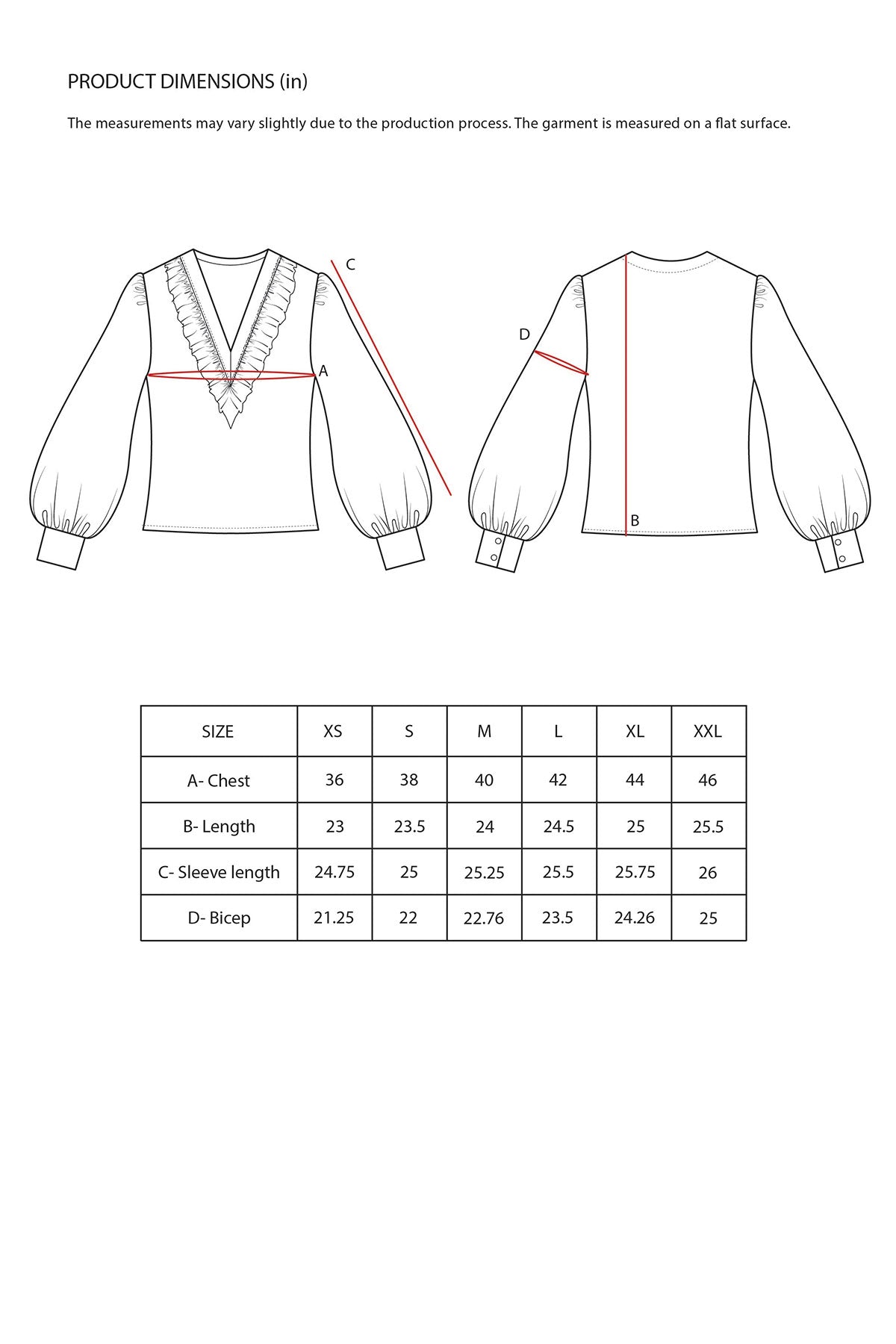 A V-neck top framed with soft ruffles and voluminous flounce sleeves. Finished with tonal Schiffli embroidery along the sleeves for a touch of crafted charm.