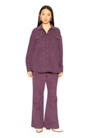 This relaxed matching set features a long-sleeved shacket with a standard collar, snap button closure, and two chest flap pockets for a boxy, structured fit. It's paired with full-length trousers that are fitted through the hip and thigh, breaking into a subtle bell-bottom flare below the knee for an elongated, contemporary silhouette.