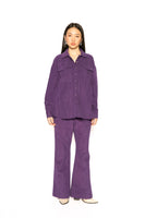 A long-sleeved shacket with a standard collar and a snap button closure. Features a boxy fit and includes two patch pockets with flaps on the chest, offering a relaxed and structured silhouette.