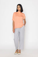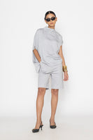 This collared turtleneck boasts a chic high-low hemline, offering a modern twist to a classic silhouette. With its relaxed fit, the standout feature lies in its unique asymmetrical sleeves, adding an designer edge to your wardrobe.