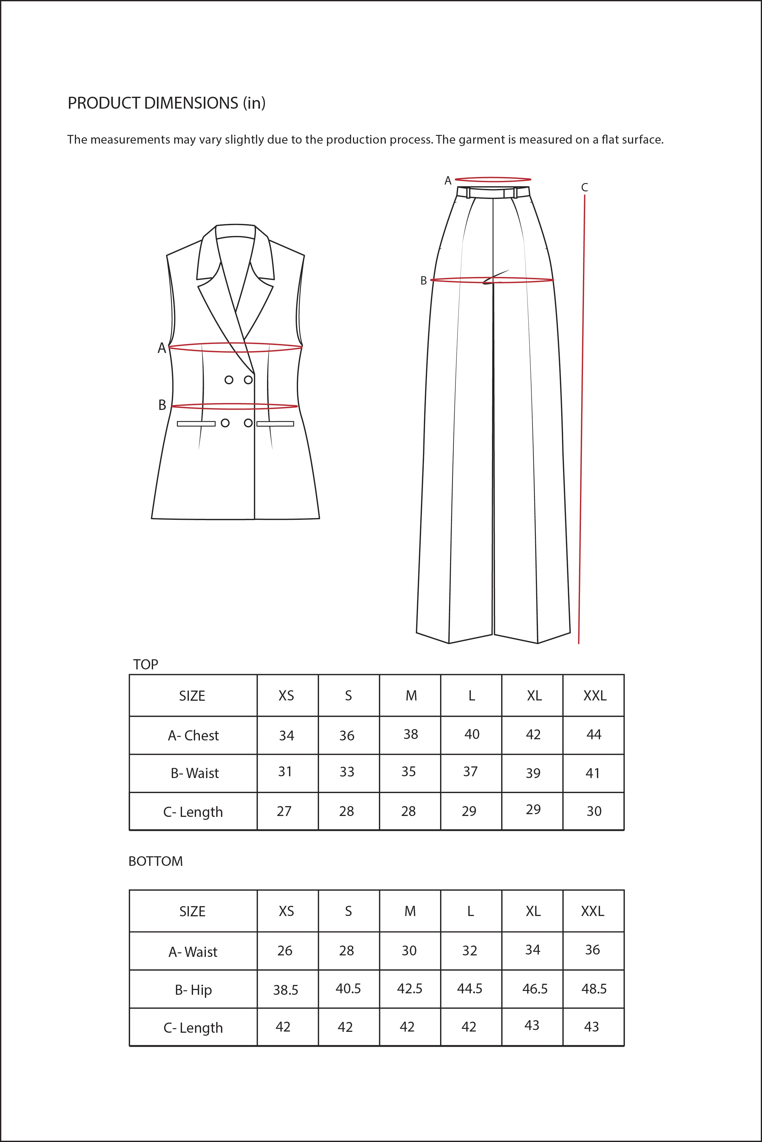 A sleeveless blazer with a structured double-breasted silhouette, metallic buttons, notched lapel, and welt pockets pairs with a high-waisted, wide-leg trouser featuring front pleats, belt loops, and side pockets. Together, they offer a polished yet comfortable look ideal for formal or business-casual settings.