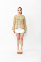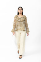 Exude effortless charm in this orange floral blouse, crafted from delicate sheer fabric for a soft, airy feel. Designed in a comfortable regular fit, it features full sleeves with flared openings, a matching flared hemline, and a romantic ruffled neckline. A coordinating slip is included for perfect coverage.