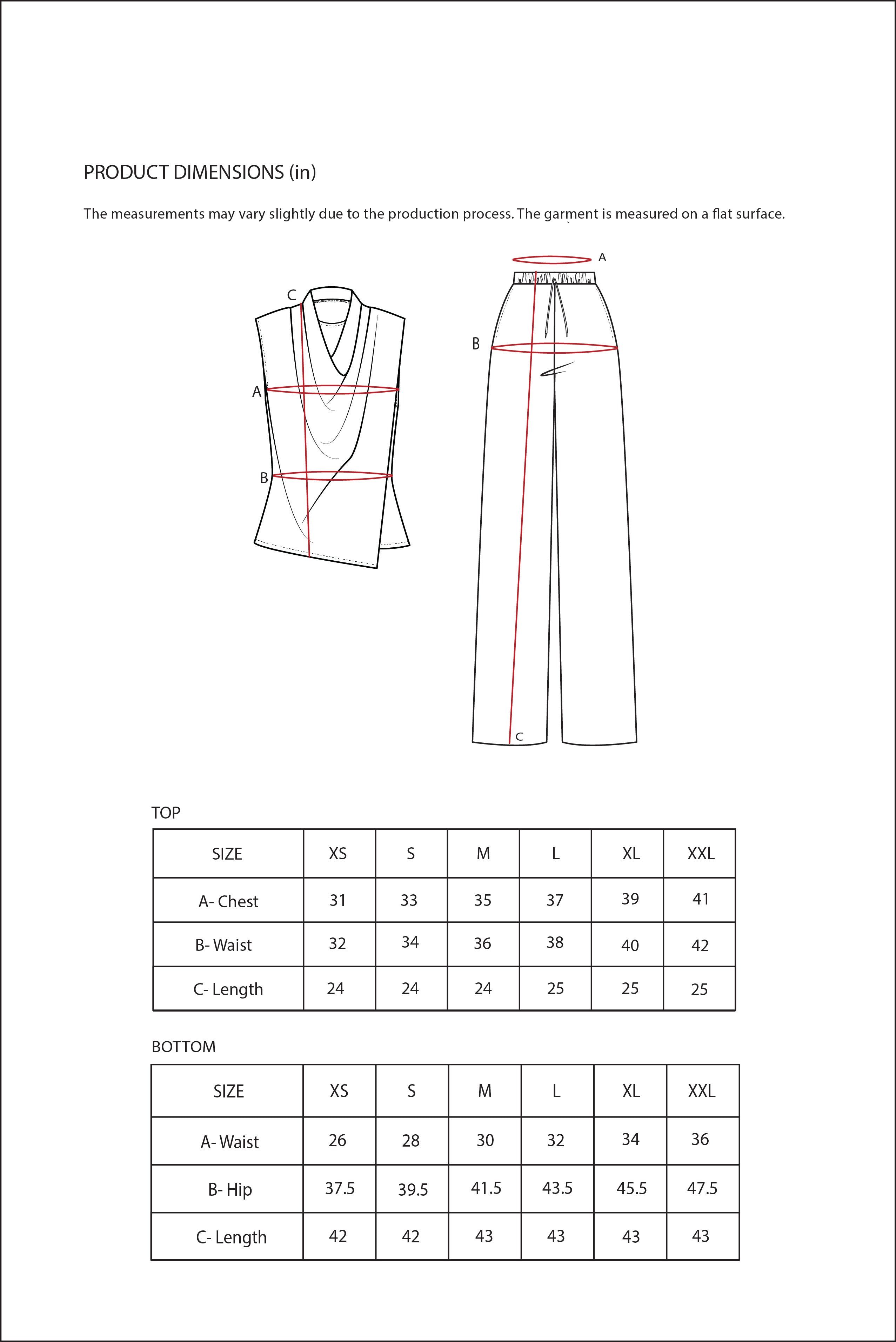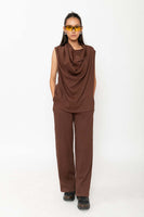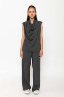 A sleeveless black top with a draped cowl neckline pairs with a relaxed-fit wide-leg trouser featuring an elasticated waistband. Made from lightweight, breathable fabric, this versatile set offers effortless elegance and comfort—perfect for casual and refined looks.