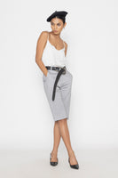 Mid-rise trousers falling just below the knee, designed with cut seam pockets, and secured effortlessly with a metal hook and zip fastening.